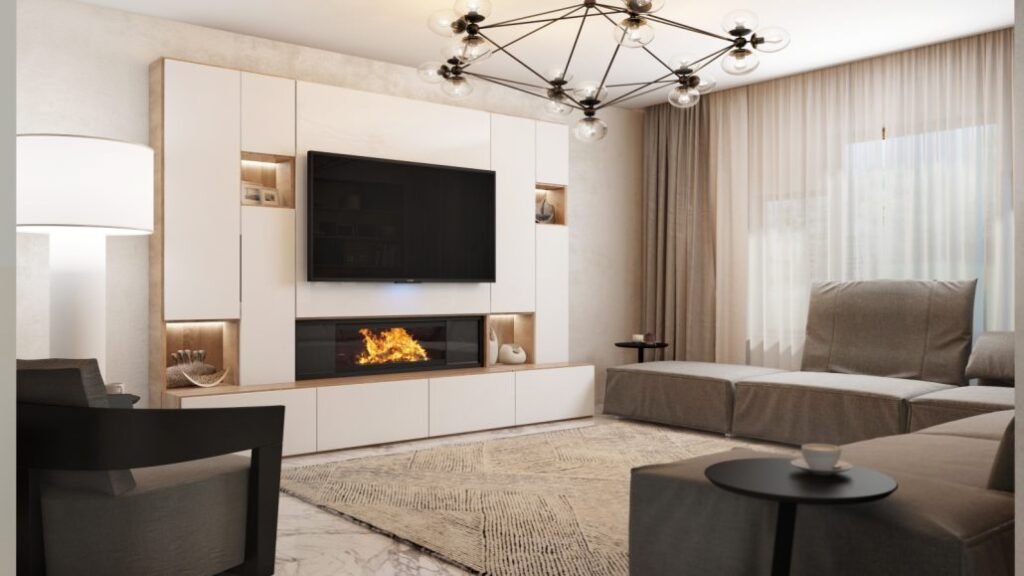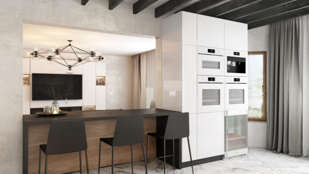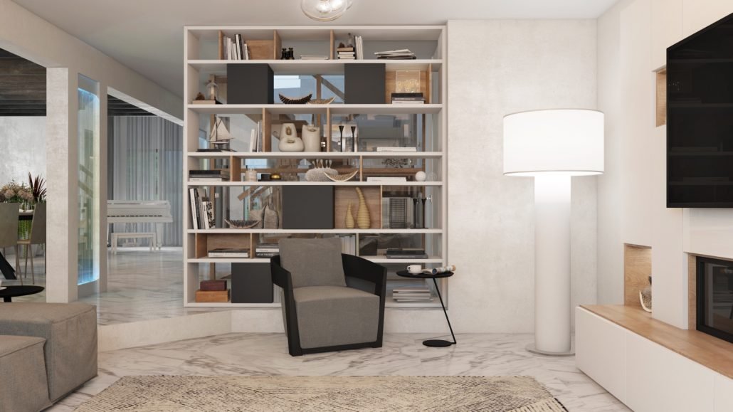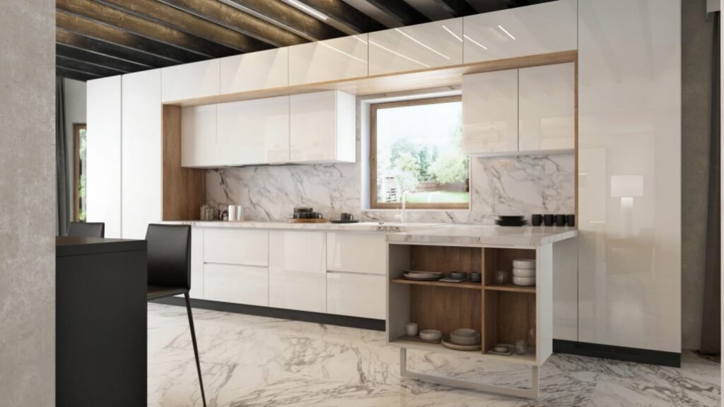 The project features high-gloss lacquer cabinetry, vertical wood accents, and built-in storage elements that structure the kitchen, living, and transitional areas. Full-height installations and recessed shelving create architectural clarity while supporting everyday functionality. Each millwork element was fabricated and installed to align precisely with surrounding finishes and coordinated stone surfaces.